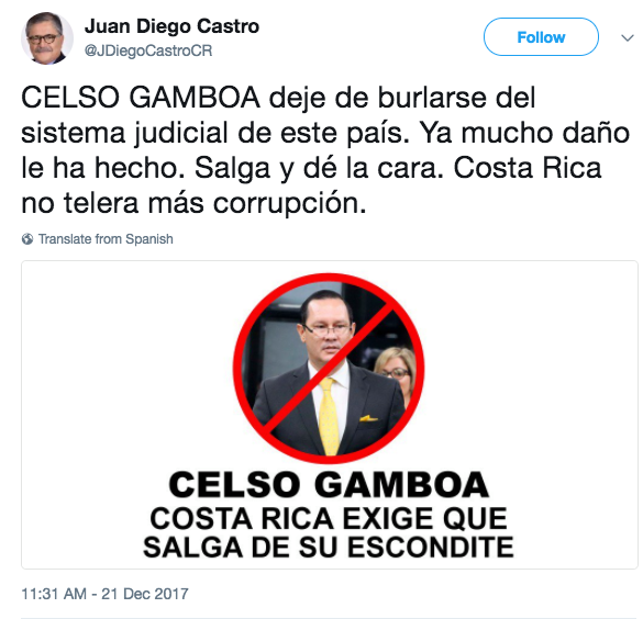 — Para amargarle más la jornada a Gamboa, cierto candidato presidencial parece haber leído el reporte y decidió romper el silencio cómplice ("es un buen muchacho") tirándole con todo al magistrado: "Celso Gamboa, deje de burlarse del sistema judicial de este país. Ya mucho daño le ha hecho. Salga y dé la cara. Costa Rica no tolera más corrupción".