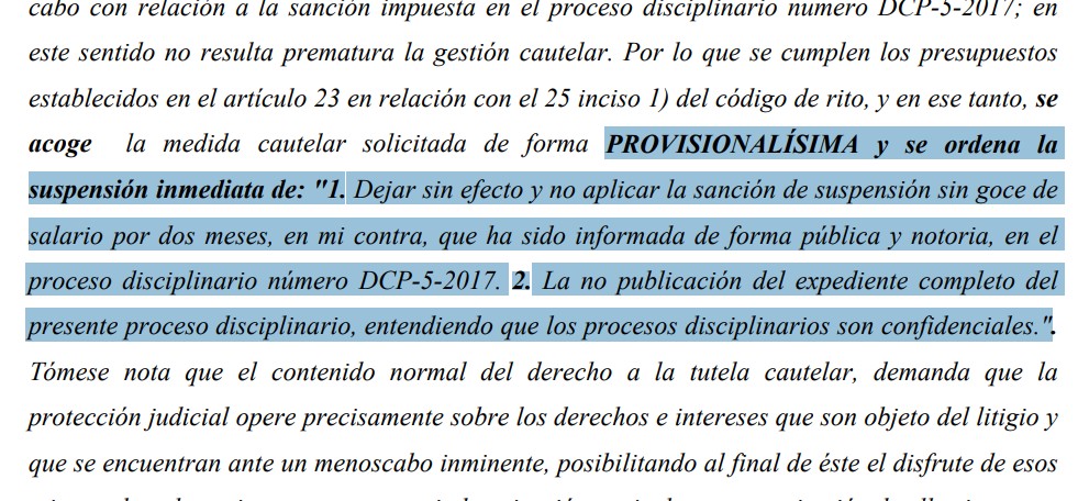 "En el presente asunto, considera este Juzgador que resulta procedente la adopción de la medida cautelar solicitada, en primer lugar por cuanto la parte concreta la urgencia de evitar el supuesto daño así como su inminencia, toda vez que analizada prima facie la documentación aportada por la gestionante, es suficiente para concreta (sic.) la urgencia, en cuanto a la afectación que le este causando el procedimiento que se esta llevando a cabo con relación a la sanción impuesta en el proceso disciplinario numero DCP-5-2017; en este sentido no resulta prematura la gestión cautelar", dijo Godínez Prado en su resolución.