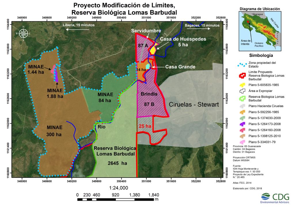 - Hacienda Ciruelas SP S.A: a la cual se le expropiarían 25 hectáreas. Los estudios técnicos realizados por la Organización de Estudios Tropicales señalaban que esa finca específicamente no era necesaria como parte de la compensación a la Reserva Biológica y que la finca utilizada para la ganadería y la expropiación afecta la única fuente de agua para los animales al cortarle el acceso a la única quebrada que es parte del terreno.