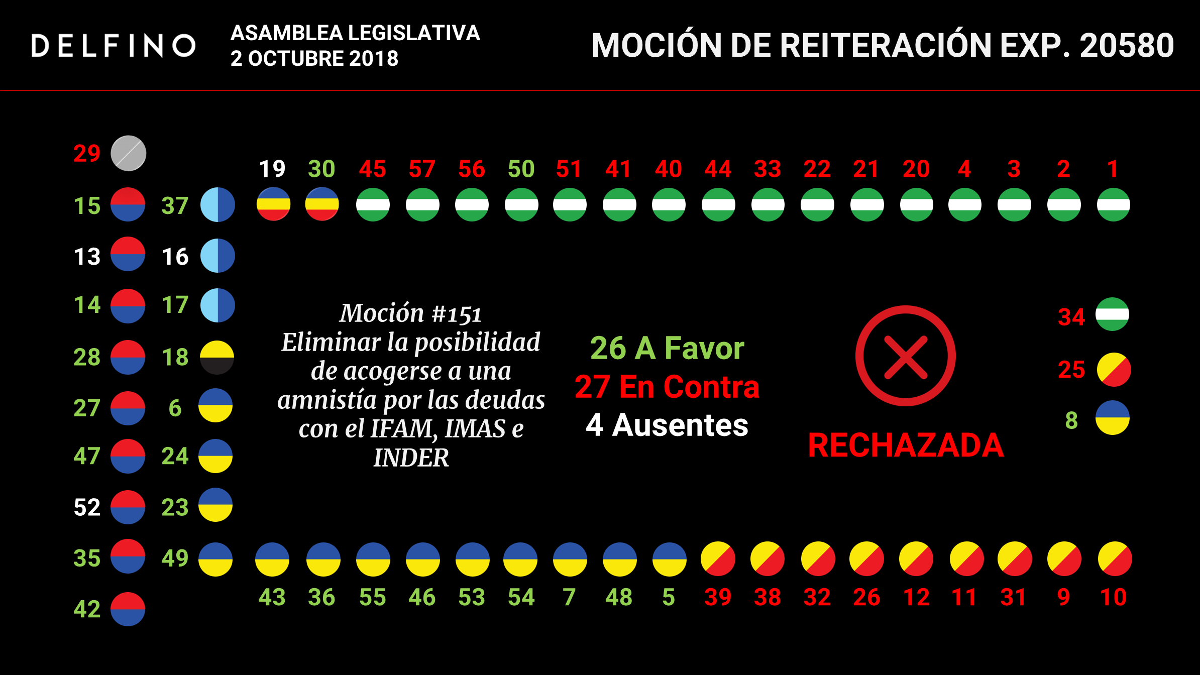 La moción fue rechazada con los votos de Liberación Nacional (excepto de la diputada Franggi Nicolás que votó a favor), Acción Ciudadana y el independiente Erick Rodríguez, sumando en su conjunto 27 votos negativos.