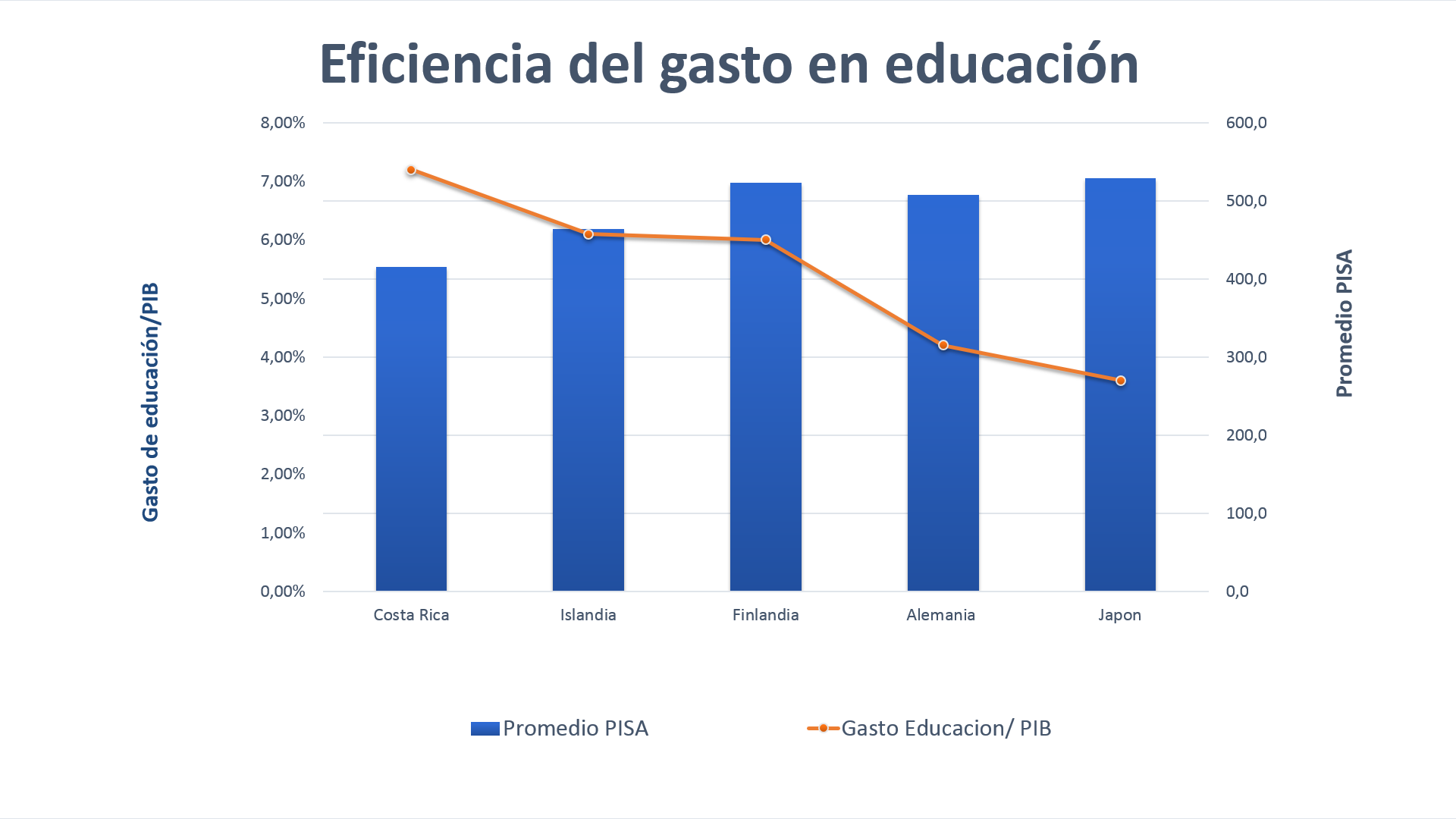 Siguiendo otros indicadores como las pruebas del Programa para la Evaluación Internacional de los Alumnos (PISA) vemos que estamos muy por debajo de estos países que realizan una inversión mucho menor que Costa Rica. El problema recae en la eficiencia en la utilización de los recursos públicos, donde el MEP y las universidades Públicas (UCR, UNA y TEC) no han utilizado de la mejor manera estas partidas educativas. Organizaciones como la OCDE ha manifestado de una manera clara que estos recursos girados para educación son sumamente ineficientes tanto con relación al proceso de aprendizaje como en términos de reducción de la desigualdad.