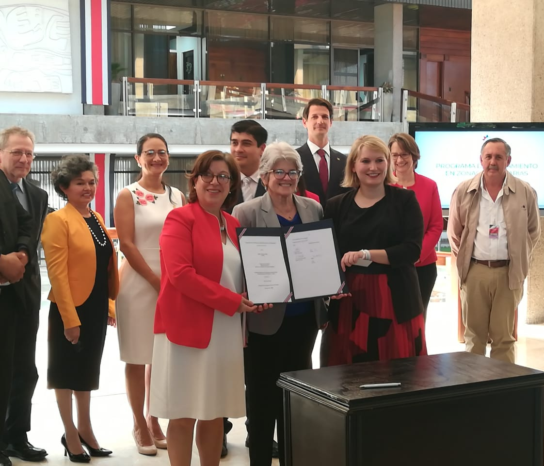 El contrato fue firmado este jueves por parte de la ministra de Hacienda, Rocío Aguilar Montoya; la presidenta ejecutiva del AyA, Yamileth Astorga; y los funcionarios del banco KfW, Thomas Wittur y Viola Bold.