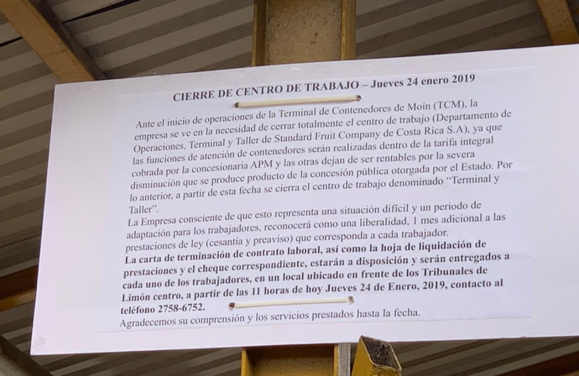 — Otra de esas noticias difíciles de digerir nos llegó esta mañana de parte de la empresa Standard Fruit Company, subsidiaria de Dole, al anunciar el cierre del Departamento de Operaciones, Terminal y Taller de Standard Fruit Company de Costa Rica S.A en Limón, prescindiendo de los puestos laborales de alrededor de 240 colaboradores.