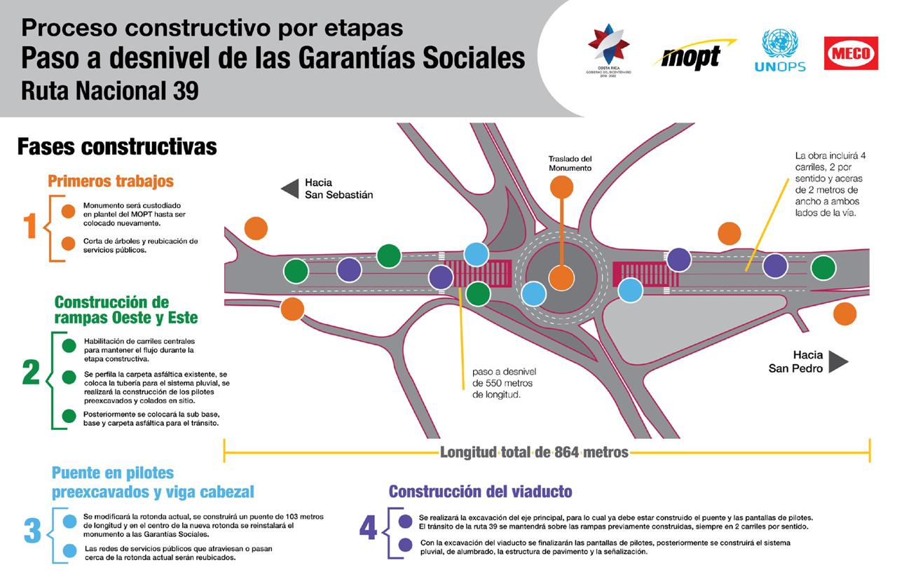 Según detalló el MOPT, las obras se ejecutarán en cuatro fases. La primera consiste en trasladar el Monumento de las Garantías Sociales, realizar corta de árboles y reubicar servicios públicos. En la segunda se construirán las rampas del sentido oeste-este y se habilitarán carriles centrales para garantizar el flujo vehicular.