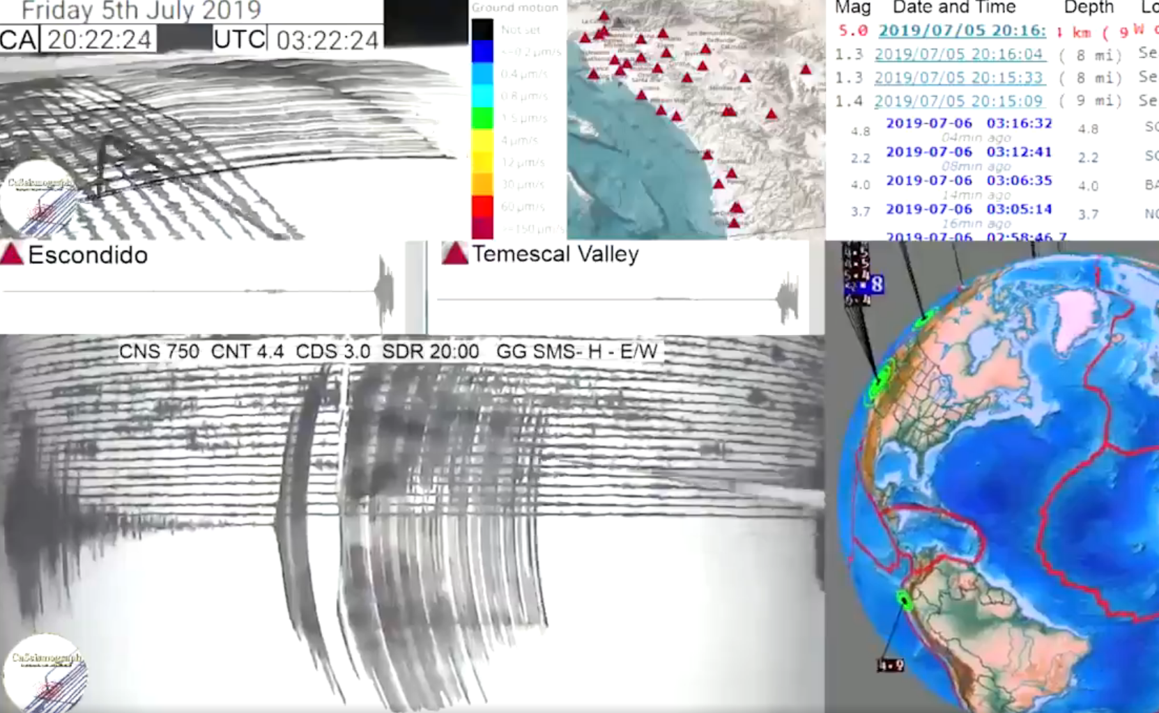 — El primer gran sismo de magnitud 6,4 se registró el jueves 4 de julio con epicentro 200 kilómetros al noreste de Los Ángeles, en la localidad de Searles Valley y tuvo una profundidad de 11 kilómetros según el Servicio Geológico de los Estados Unidos (USGS por sus siglas en Inglés), por lo que se percibió con una intensidad de 8 en la Escala de Mercalli Modificada (que va de 1 a 10). Tras este sismo se dispararon numerosas réplicas, algunas de magnitud 4 y 5; se reportaron deslizamientos, incendios, daños estructurales menores e importantes pérdidas en tiendas comerciales.