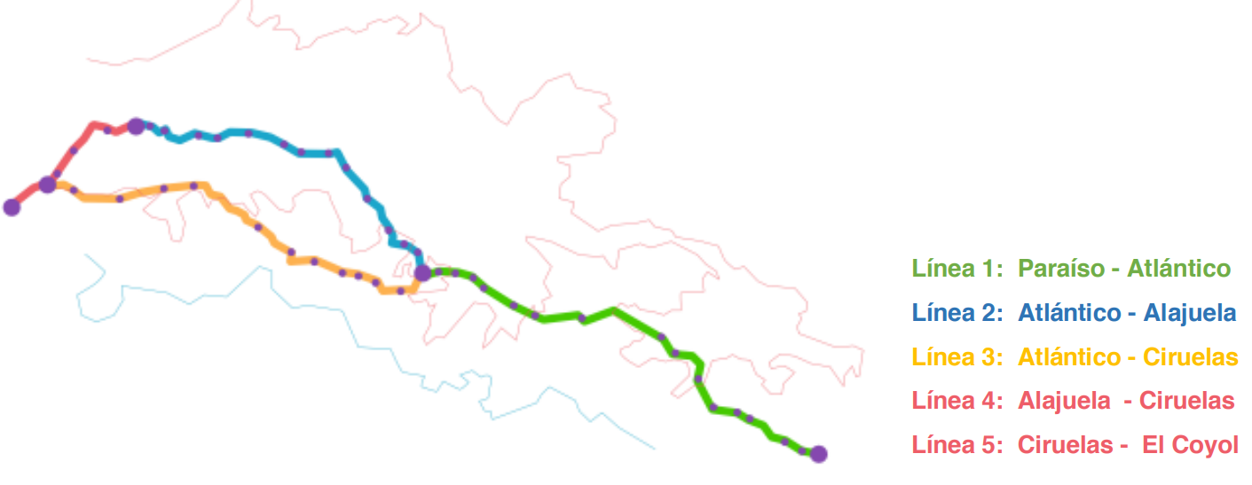 El tren eléctrico contaría con cinco líneas: una que conecte Paraíso de Cartago con la estación al Atlántico; una que conecte la estación al Atlántico con Alajuela; una que comunique el Atlántico con Ciruelas y otra que haga el mismo recorrido en sentido contrario; y finalmente una que comunique Ciruelas con El Coyol de Alajuela.