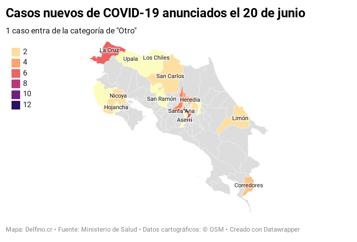 Finalmente, Santa Cruz, Oreamuno, Moravia, Aserrí, Guatuso, Curridabat, Hojancha, Escazú, Los Chiles, Upala, Alajuelita y San Ramón registraron un caso. Una infección más fue ubicada dentro de la categoría "Otro".