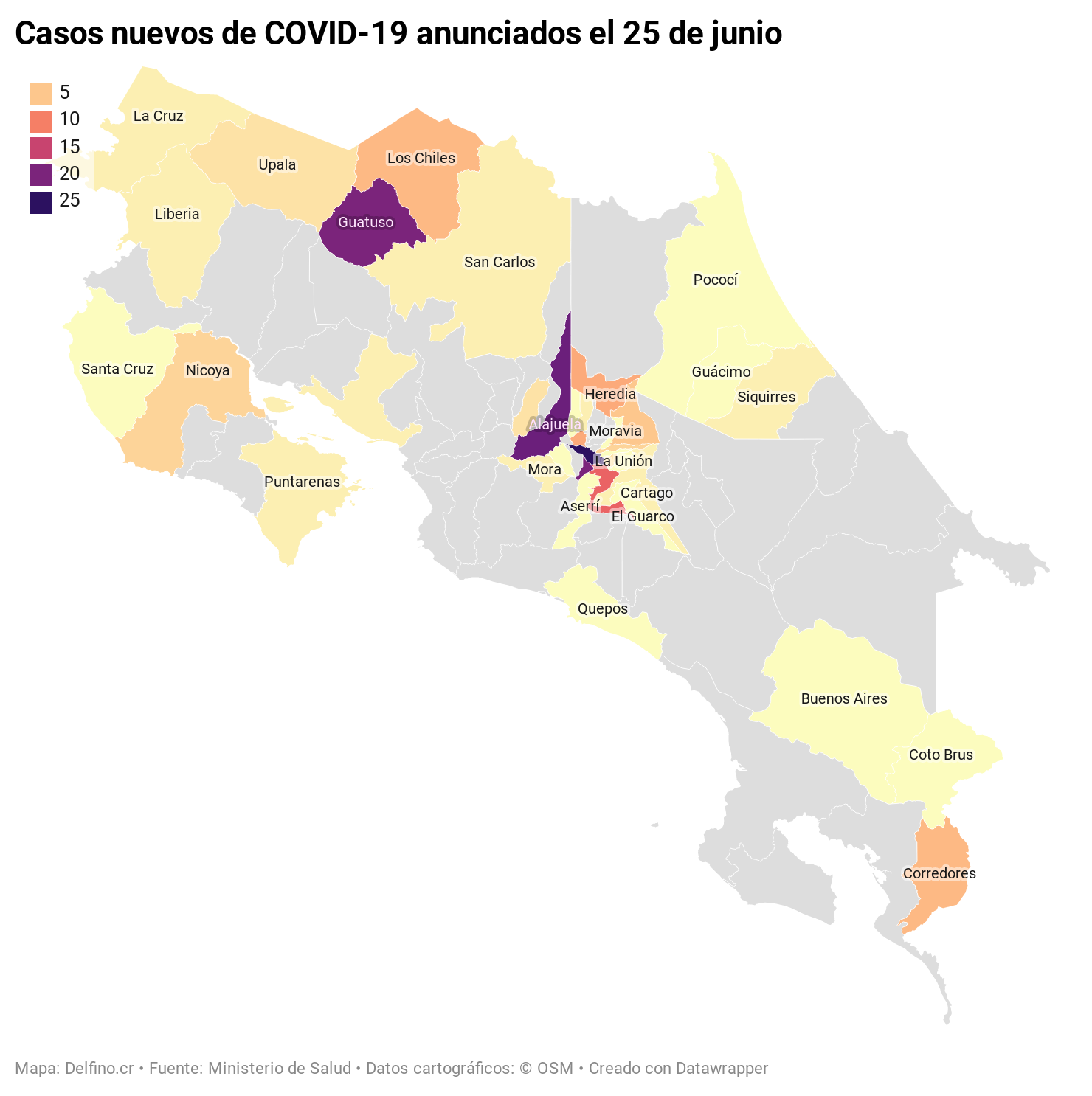 Los cantones de San José, Alajuela, Alajuelita, Guatuso y Desamparados reportaron la mayor cantidad de casos nuevos anunciados hoy. San José sumó 25 nuevos casos, Alajuela 21 nuevas infecciones, Alajuelita y Guatuso 20 nuevos casos y Desamparados 12 infecciones.