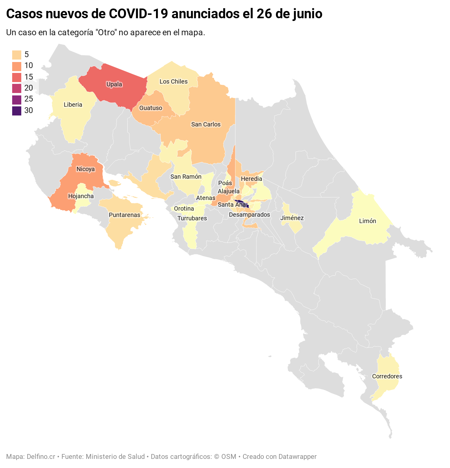 Los cantones de San José, Upala y Nicoya reportaron la mayor cantidad de casos nuevos anunciados hoy. San José sumó 33 nuevos casos, Upala 15 nuevas infecciones y Nicoya 10 nuevos casos.