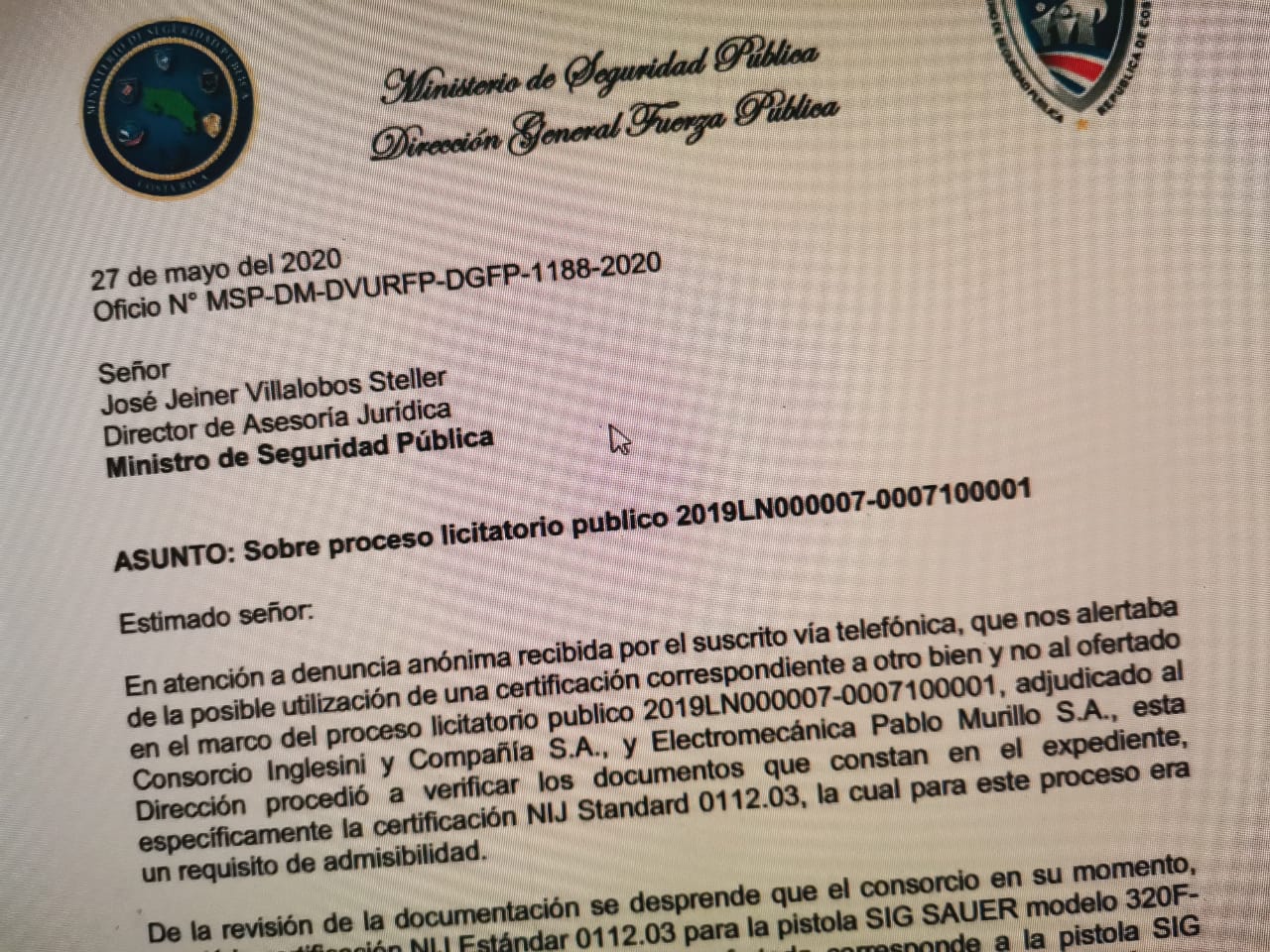 Un documento en poder de Delfino.cr señala que el oferente presentó una certificación que no corresponde al tipo de arma que la Policía deseaba adquirir. Esa falencia fue detectada inicialmente, pero al solicitarle a la empresa que subsanara ese aspecto, presentó una declaración jurada de la casa fabricante en los Estados Unidos que señalaba que el certificado sí era válido.
