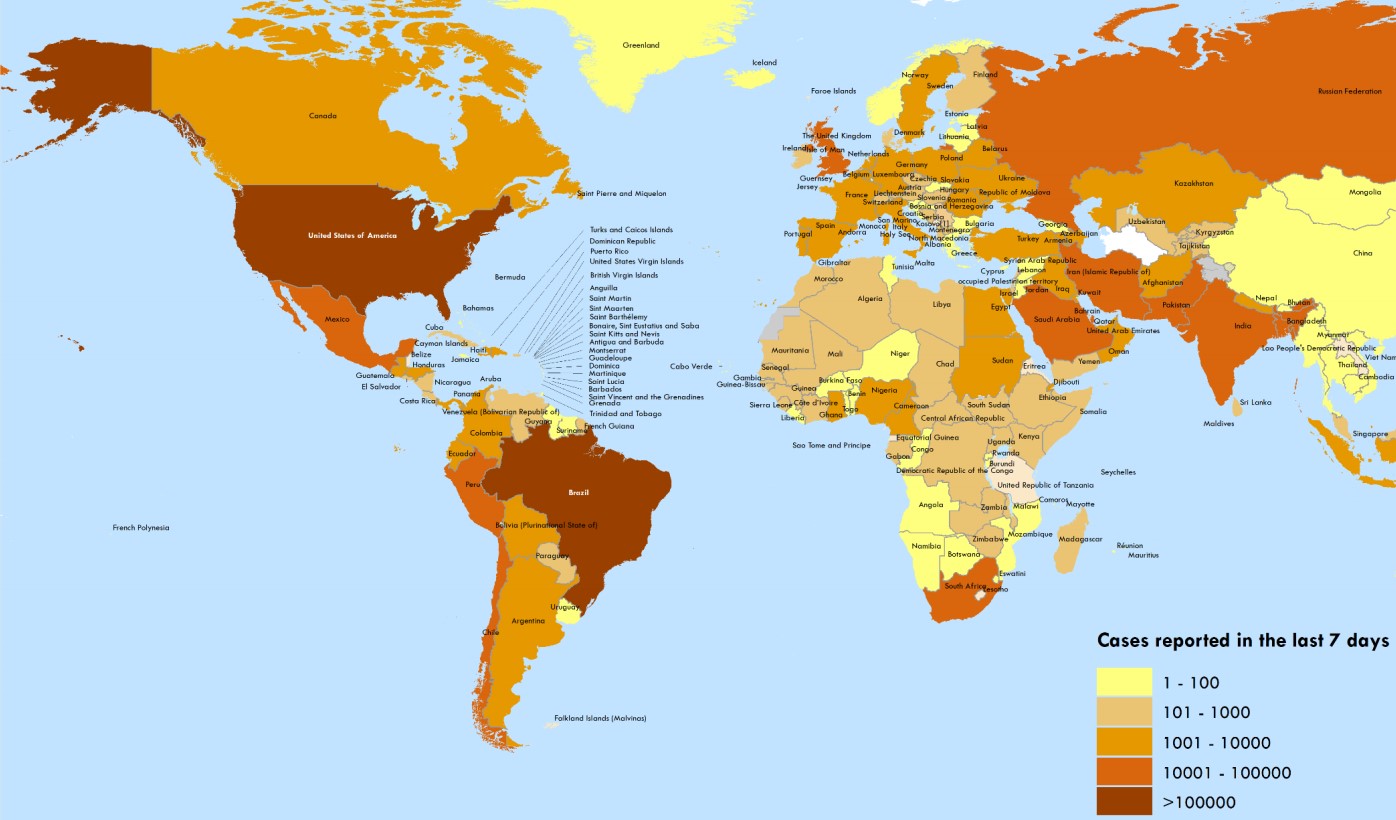 En los últimos cinco días se han reportado más de 100 mil casos nuevos de COVID-19 a la organización, siendo las Américas el nuevo epicentro del brote: cada día de reporte, el continente supera la suma de los casos nuevos registrados en el resto del mundo.