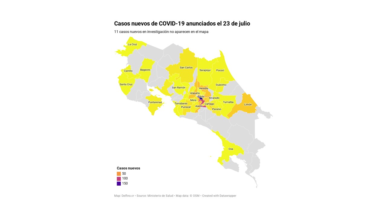 Otros 11 casos nuevos no fueron ubicados en ningún cantón pues siguen bajo investigación. El número de casos pendientes de domicilio cantonal asciende ya a 335, de los cuales 316 casos están activos.