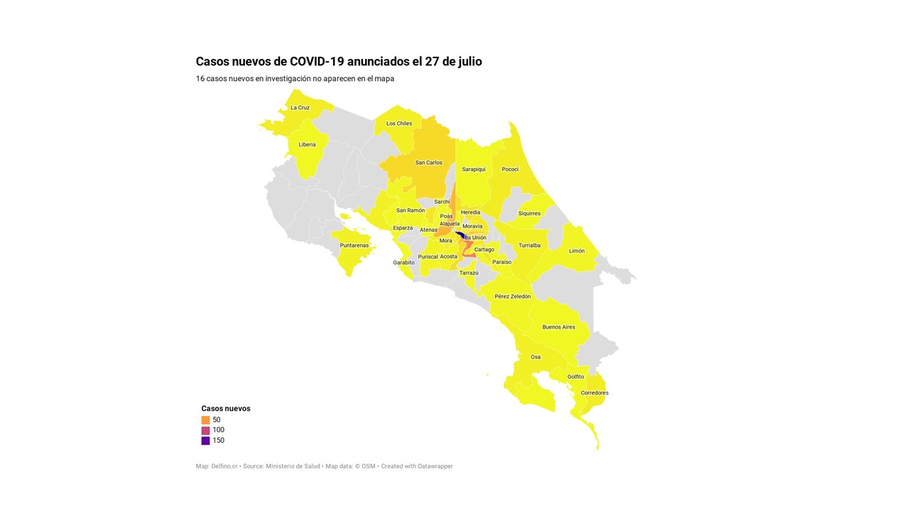 11 cantones reportaron entre cuatro y dos casos nuevos: en Puntarenas y Osa fueron cuatro, en Poás, Puriscal, San Isidro y Acosta fueron tres, y en San Ramón, Limón El Guarco, Sarchí y Pérez Zeledón se registraron dos nuevos casos.