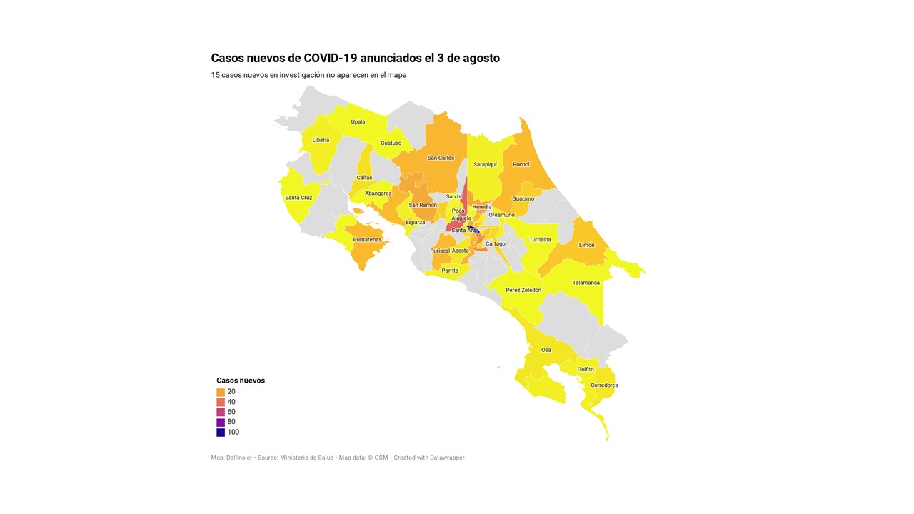 Otros 15 casos nuevos no fueron ubicados en ningún cantón pues siguen bajo investigación. El número de casos pendientes de domicilio cantonal asciende ya a 420, de los cuales 410 casos están activos.