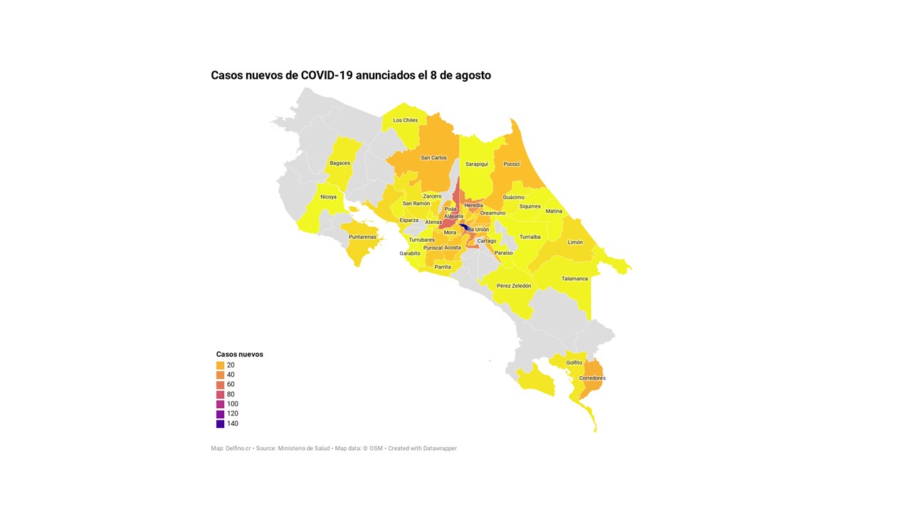 El Ministerio de Salud de Costa Rica informó la tarde de hoy que los 721 casos nuevos de COVID-19 registrados en el país se ubican en 57 de los 81 cantones que tienen al menos un caso confirmado reportado desde el inicio de la pandemia.