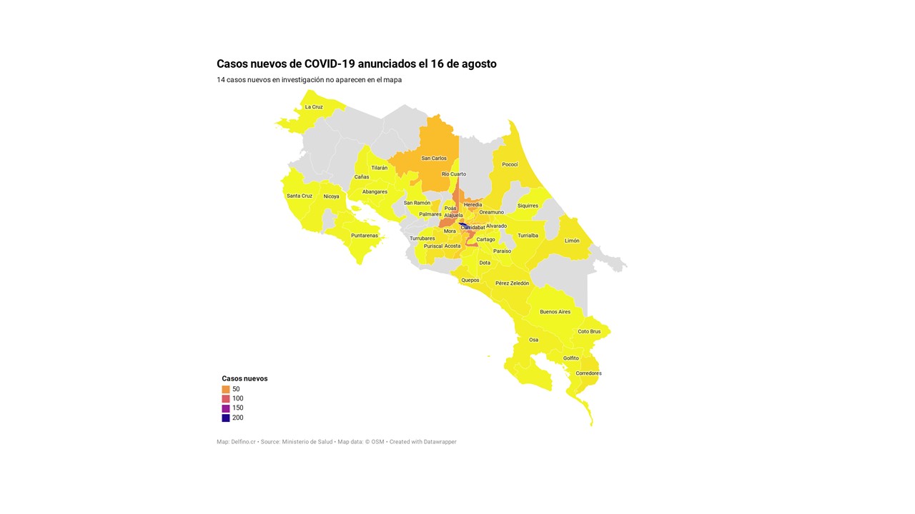 Otros 14 casos nuevos no fueron ubicados en ningún cantón pues siguen bajo investigación. El número de casos pendientes de domicilio cantonal asciende ya a 498, de los cuales 481 casos están activos.