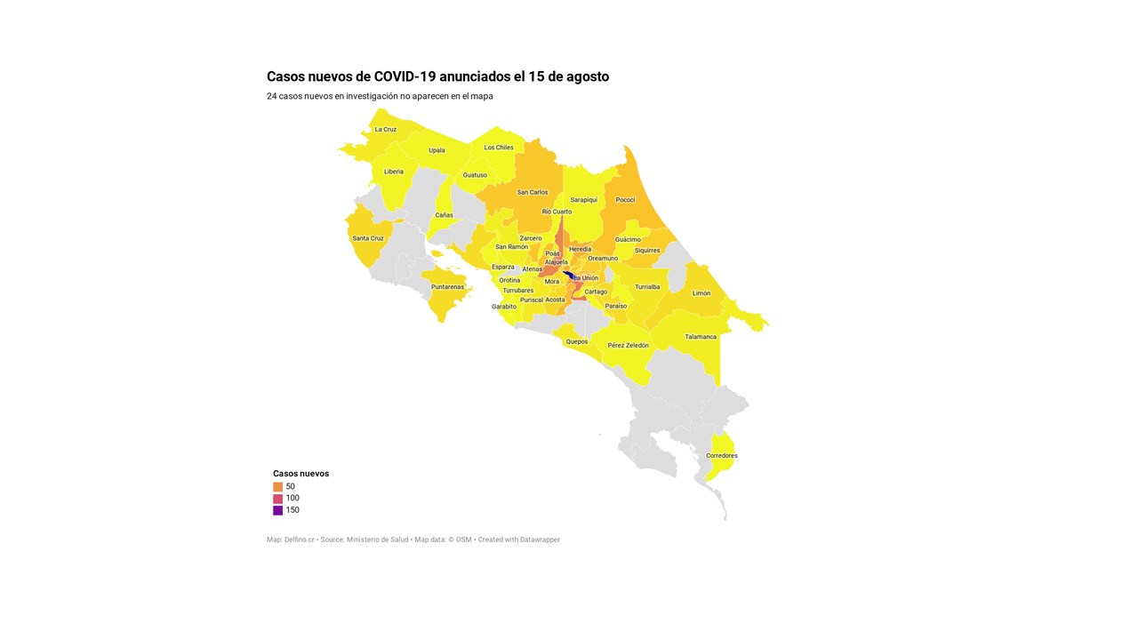 Otros 24 casos nuevos no fueron ubicados en ningún cantón pues siguen bajo investigación. El número de casos pendientes de domicilio cantonal asciende ya a 495, de los cuales 478 casos están activos.