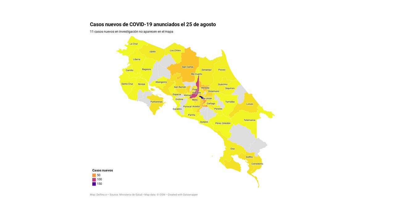 Otros 11 casos nuevos no fueron ubicados en ningún cantón pues siguen bajo investigación. El número de casos pendientes de domicilio cantonal asciende ya a 382, de los cuales 355 casos están activos.