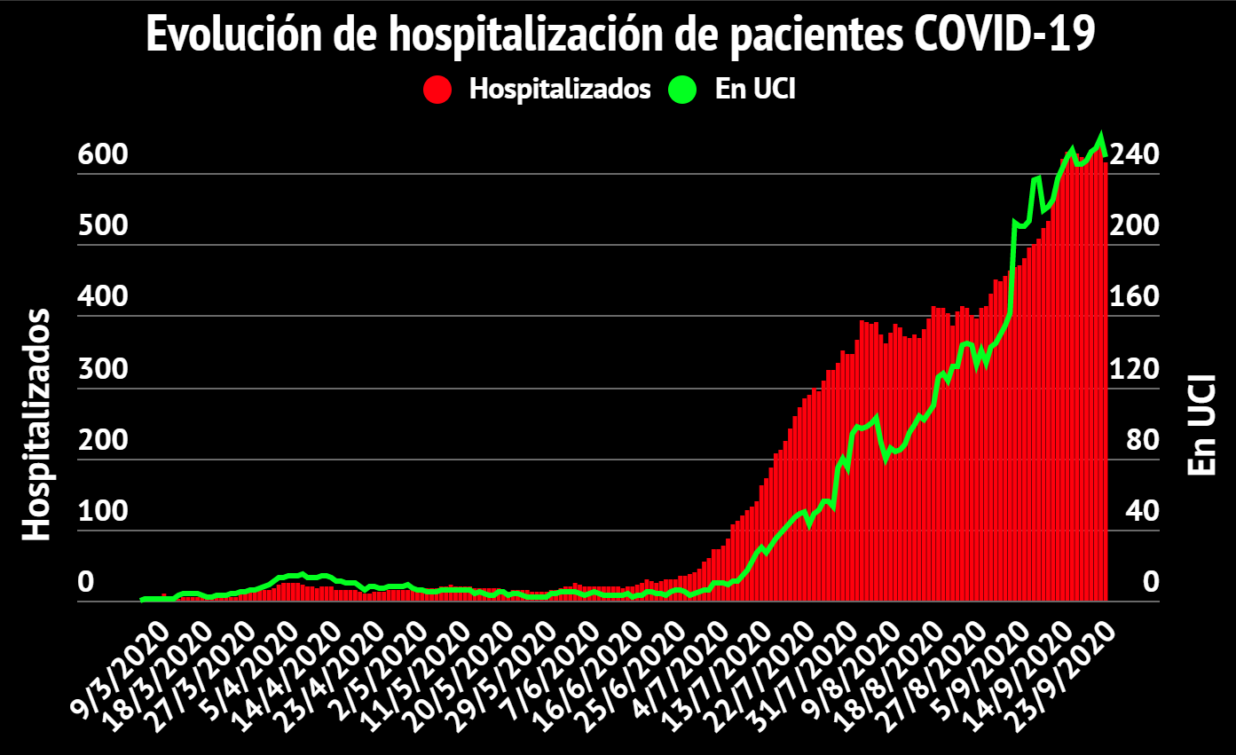 Hay 616 personas hospitalizadas (-21 respecto a ayer) de las cuales 249 están internadas en Unidades de Cuidados Intensivos (-11) con edades de entre 1 a 91 años. El porcentaje de ocupación hospitalaria para pacientes COVID-19 llegó hoy a 46.22% en camas para moderados (capacidad actual 460 de una meta de 1005) y 80.84% en camas de cuidados intensivos (capacidad actual de 297 de una meta de 359).