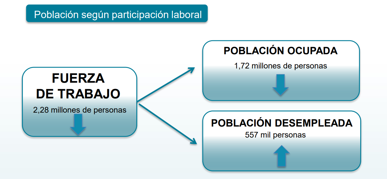 La estadística de población ocupada nacional fue de 1.72 millones de personas, una disminución interanual de 475 mil personas. Para este segundo trimestre está compuesta por 1.10 millones de hombres y 619 mil mujeres.