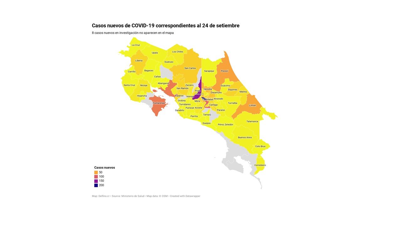 Otros 8 casos nuevos no fueron ubicados en ningún cantón pues siguen bajo investigación. El número de casos pendientes de domicilio cantonal asciende ya a 486, de los cuales 469 casos están activos.