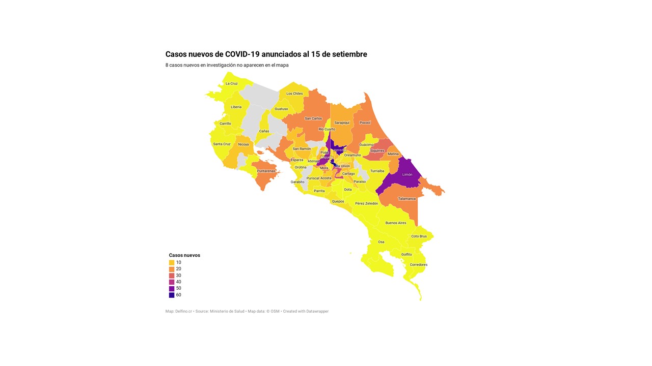 Otros 8 casos nuevos no fueron ubicados en ningún cantón pues siguen bajo investigación. El número de casos pendientes de domicilio cantonal asciende ya a 518, de los cuales 488 casos están activos.