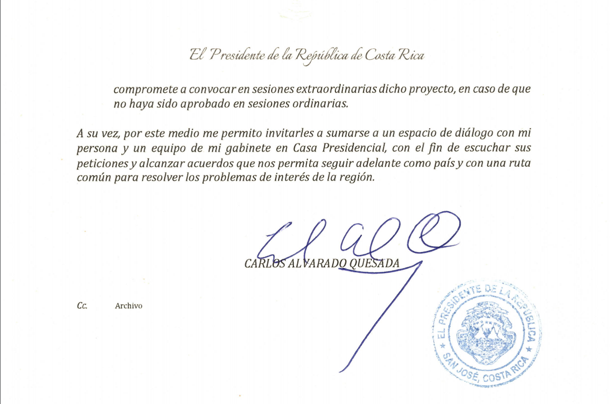 Las peticiones fueron enviadas al Presidente como parte del proceso de diálogo que, con los dirigentes de las protestas en Pérez Zeledón, realiza el presidente del Consejo Nacional de la Producción (CNP), Rogis Bermúdez, y que como primer resultado dio la apertura intermitente del paso por esa zona.