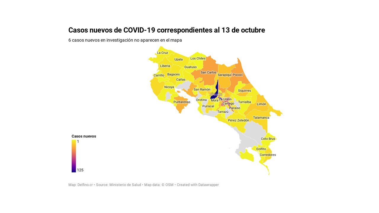 De todos los cantones con casos nuevos, once acumulan más de la mitad (53.40%) de los casos del 13 de octubre, siendo el cantón central de Alajuela el más afectado con 125 nuevos casos, seguido de San José con 122; Cartago con 61; Desamparados con 41; Heredia con 34; Pococí y San Carlos con 33; Puntarenas con 27; Tibás con 24; Goicoechea con 21 y Sarapiquí con 21.