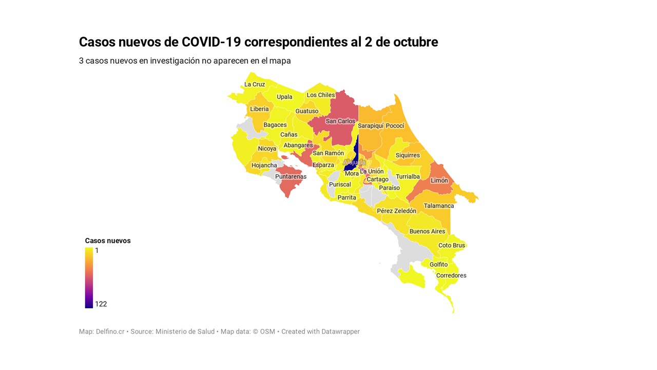 Otros 3 casos nuevos no fueron ubicados en ningún cantón pues siguen bajo investigación. El número de casos pendientes de domicilio cantonal asciende ya a 493, de los cuales 317 casos están activos.