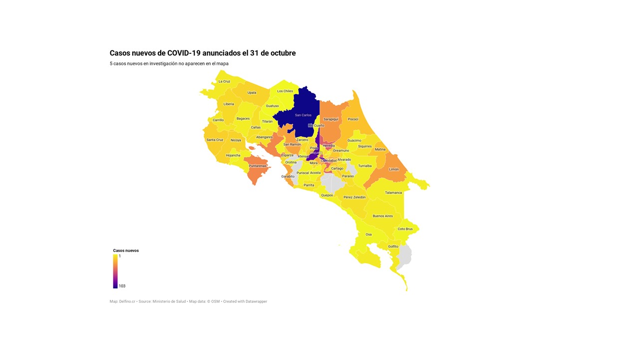 Otros 5 casos nuevos no fueron ubicados en ningún cantón pues siguen bajo investigación. El número de casos pendientes de domicilio cantonal asciende ya a 589, de los cuales 276 casos están activos.
