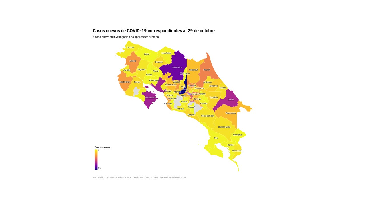 Otros 6 casos nuevos no fueron ubicados en ningún cantón pues siguen bajo investigación. El número de casos pendientes de domicilio cantonal asciende ya a 590, de los cuales 280 casos están activos.