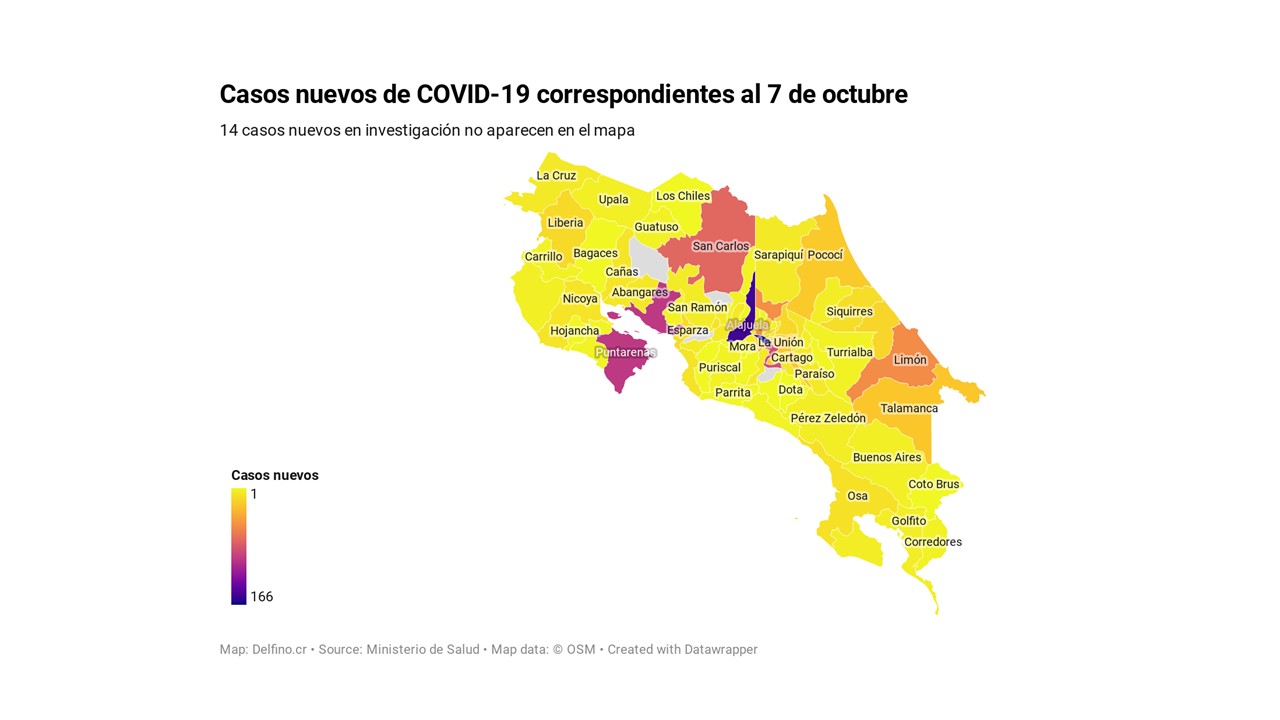 Otros 14 casos nuevos no fueron ubicados en ningún cantón pues siguen bajo investigación. El número de casos pendientes de domicilio cantonal asciende ya a 532, de los cuales 238 casos están activos.