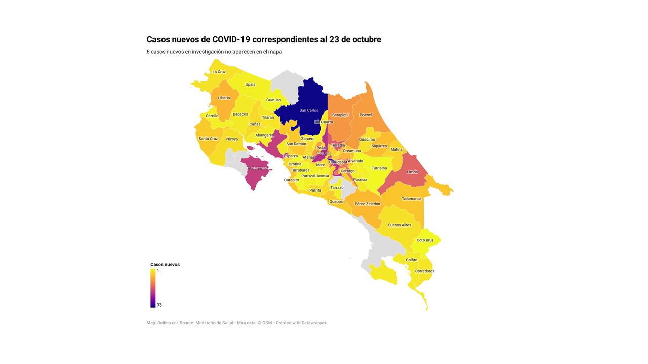 El Ministerio de Salud de Costa Rica informó la tarde de hoy que los 1210 casos nuevos de COVID-19 registrados en el país se ubican en 76 de los 82 cantones, los que no reportaron casos nuevos son: Dota, Hojancha, León Cortés, Los Chiles, Nandayure y Osa.