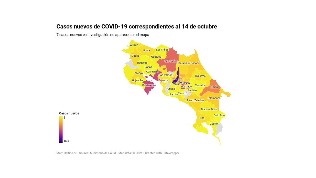 De todos los cantones con casos nuevos, nueve acumulan la mitad (50.45%) de los casos del 14 de octubre, siendo el cantón central de San José el más afectado con 163 nuevos casos, seguido de Alajuela con 143; Desamparados con 93; Puntarenas con 91; San Carlos con 73; La Unión con 63; Limón con 58; Cartago con 50; Alajuelita con 44.