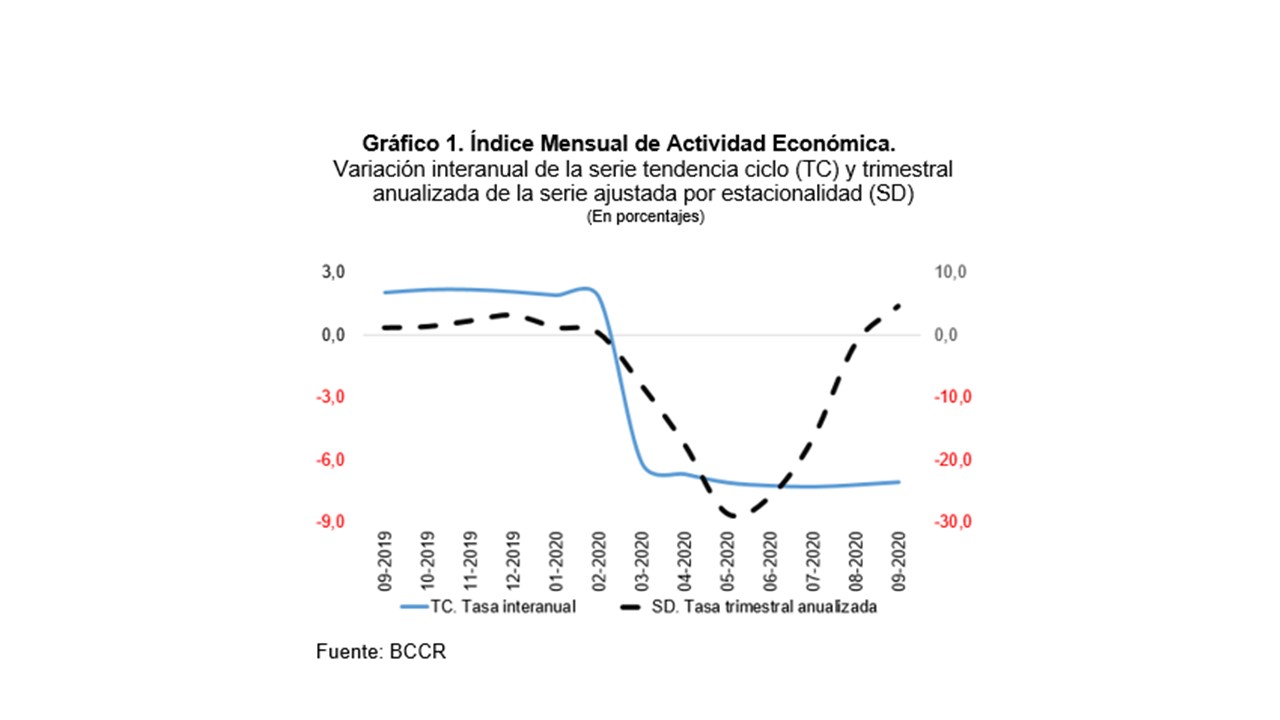 El Banco Central de Costa Rica presentó los resultados del Índice Mensual de Actividad Económica (IMAE) correspondientes al mes de septiembre, que muestran un caída interanual del 7.1%, producto de la crisis generada por la pandemia de COVID-19. Sin embargo, al analizar la variación trimestral de la serie (ajustada por estacionalidad) se registró un crecimiento de 4.6%, señal de que la economía se encuentra en un proceso gradual de recuperación económica.