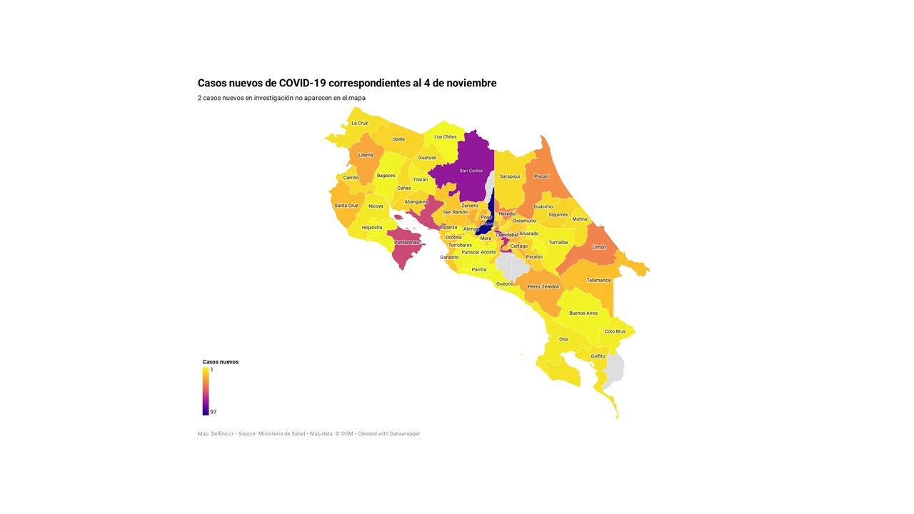 Otros 2 casos nuevos no fueron ubicados en ningún cantón pues siguen bajo investigación. El número de casos pendientes de domicilio cantonal asciende ya a 596, de los cuales 279 casos están activos.