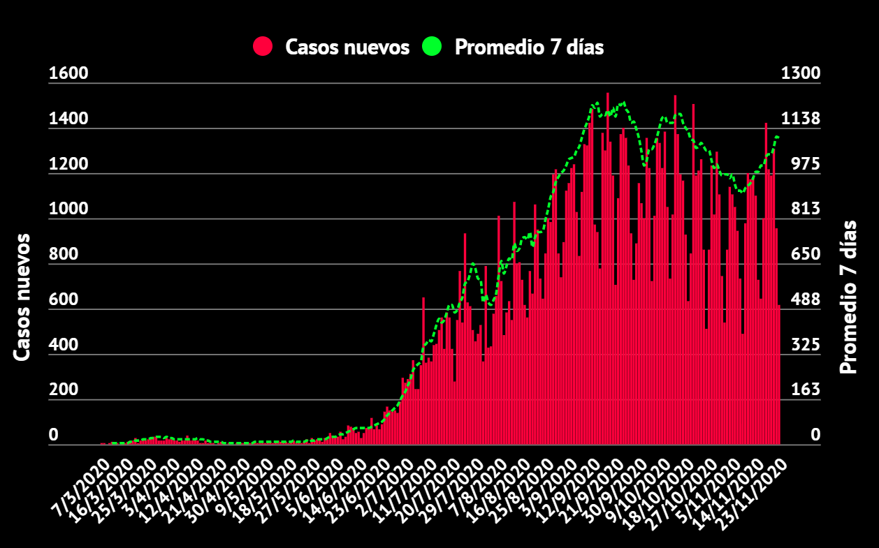 El sábado 21 de noviembre se reportaron 1304 casos nuevos, de los cuales 1007 corresponden a casos confirmados por prueba PCR analizada en un laboratorio acreditado y los otros 297 corresponden a casos confirmados por nexo, es decir, personas que desarrollaron síntomas de COVID-19 y conviven con personas que dieron positivo en la prueba PCR para detectar SARS-CoV-2.