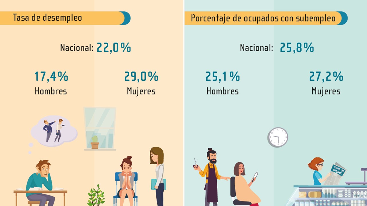 En total, se proyecta que el país tuvo en el tercer trimestre 520 mil personas desempleadas, de las cuales un poco más de la mitad son mujeres —270 mil desempleadas con una tasa de 29.0%— en comparación con los hombres —250 mil desempleados con una tasa de 17.4%— .