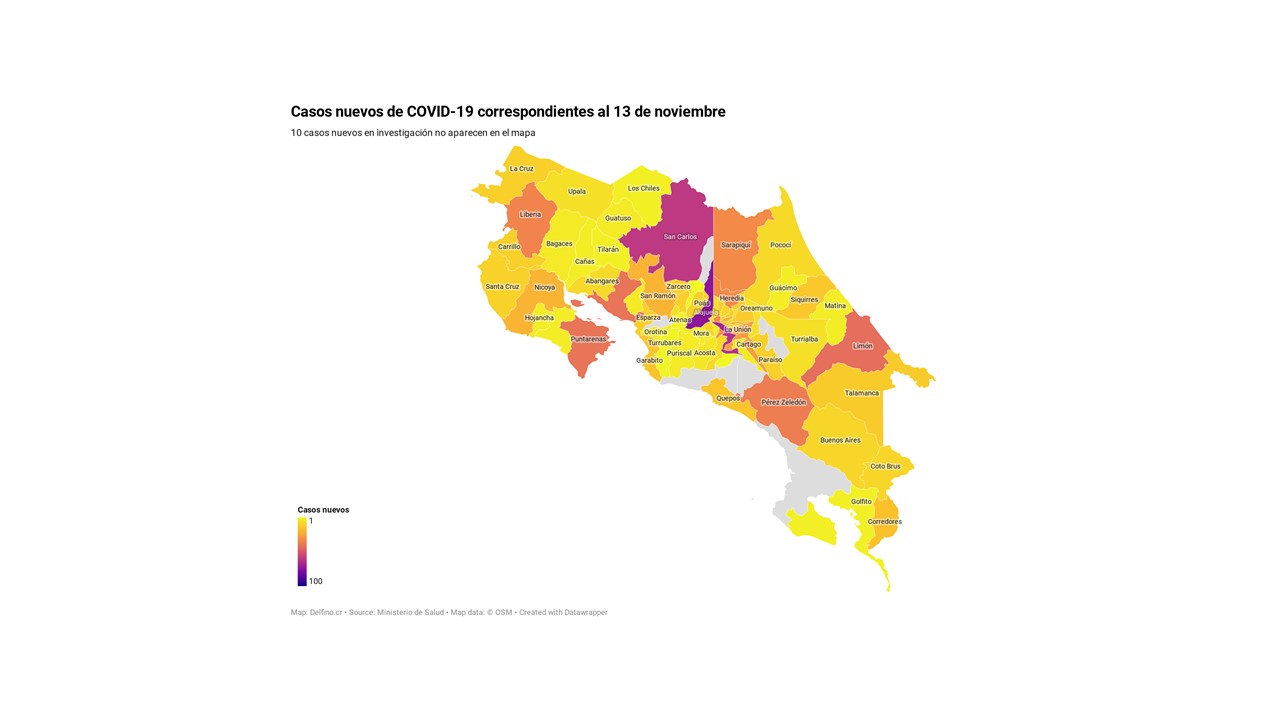 Otros 10 casos nuevos no fueron ubicados en ningún cantón pues siguen bajo investigación. El número de casos pendientes de domicilio cantonal asciende ya a 567, de los cuales 284 casos están activos.