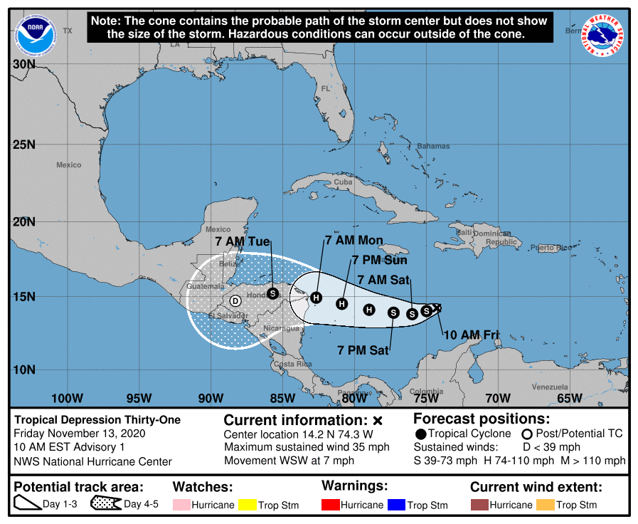 El Centro Nacional de Huracanes de los Estados Unidos (NHC) informó este viernes que la onda tropical ubicada al este del Mar Caribe ya se convirtió en la Depresión Tropical #31 de este año, y que se proyecta un fortalecimiento hasta el grado de huracán en los siguientes días.
