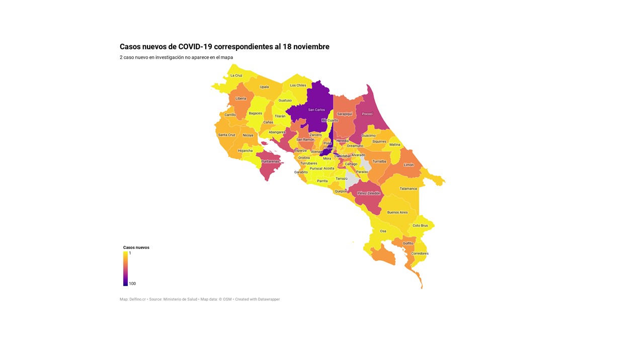 Otros 2 casos nuevos no fueron ubicados en ningún cantón pues siguen bajo investigación. El número de casos pendientes de domicilio cantonal asciende ya a 569, de los cuales 290 casos están activos.