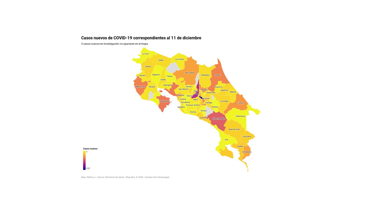 El Ministerio de Salud de Costa Rica informó la tarde de hoy que los 1132 casos nuevos de COVID-19 registrados en el país se ubican en 77 de los 82 cantones, los que no reportaron casos nuevos son: Alvarado, Dota, Guatuso, Hojancha y Río Cuarto.