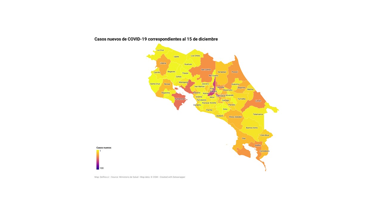 El Ministerio de Salud de Costa Rica informó la tarde de hoy que los 927 casos nuevos de COVID-19 registrados en el país se ubican en 77 de los 82 cantones, los que no reportaron casos nuevos son: Alvarado, Dota, Río Cuarto, Jiménez y Zarcero.