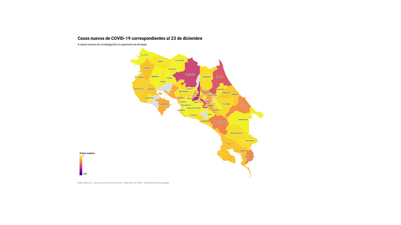 Otros 4 casos nuevos no fueron ubicados en ningún cantón pues siguen bajo investigación. El número de casos pendientes de domicilio cantonal asciende ya a 606, de los cuales 101 casos están activos.