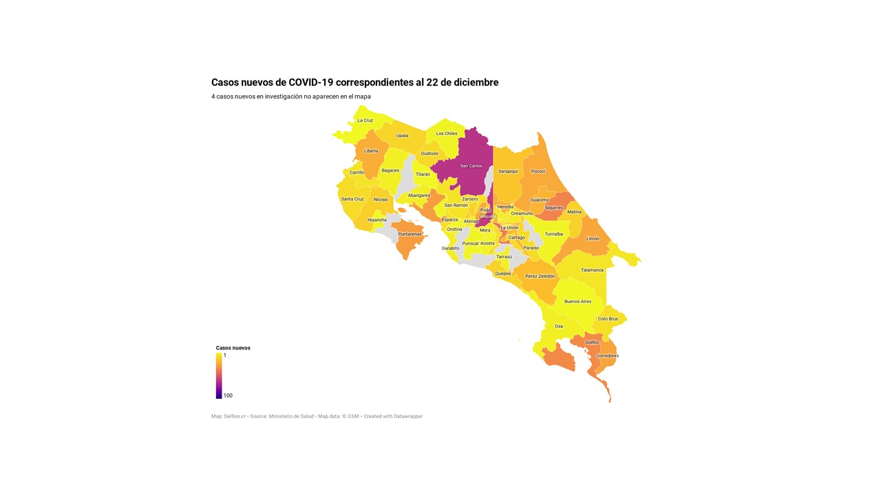 Otros 4 casos nuevos no fueron ubicados en ningún cantón pues siguen bajo investigación. El número de casos pendientes de domicilio cantonal asciende ya a 604, de los cuales 100 casos están activos.
