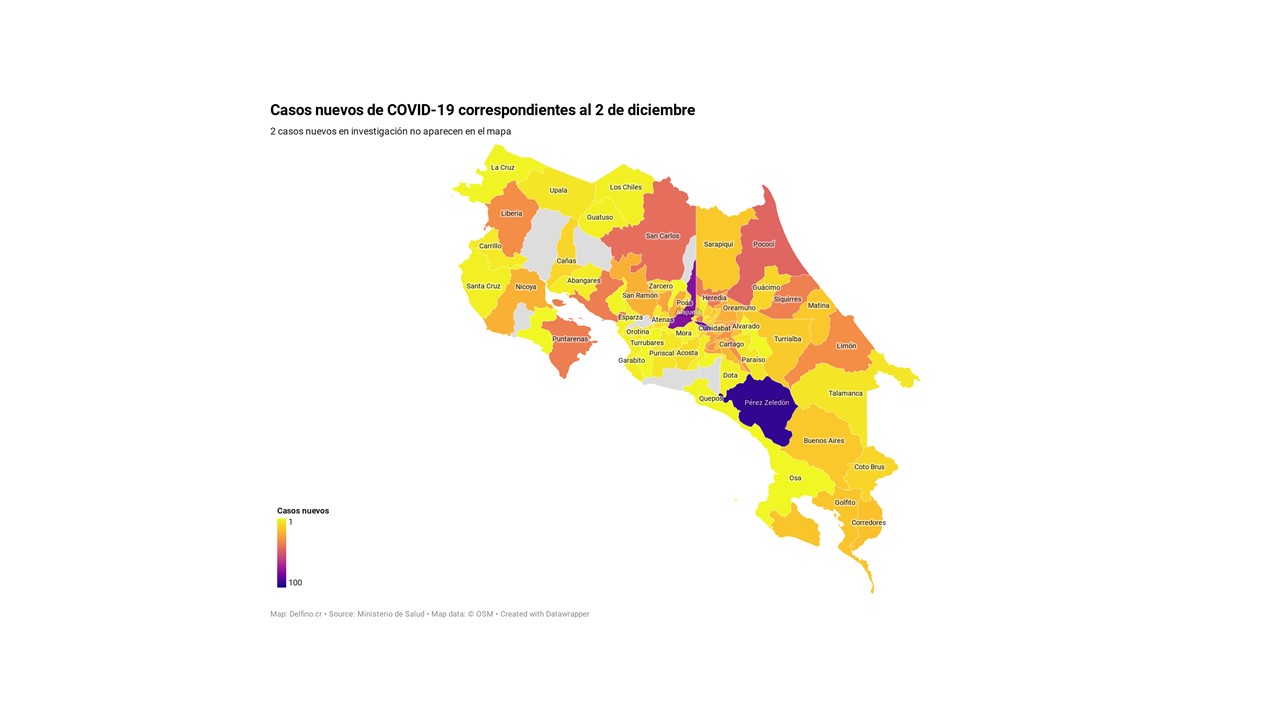 Otros 2 casos nuevos no fueron ubicados en ningún cantón pues siguen bajo investigación. El número de casos pendientes de domicilio cantonal asciende ya a 576, de los cuales 291 casos están activos.