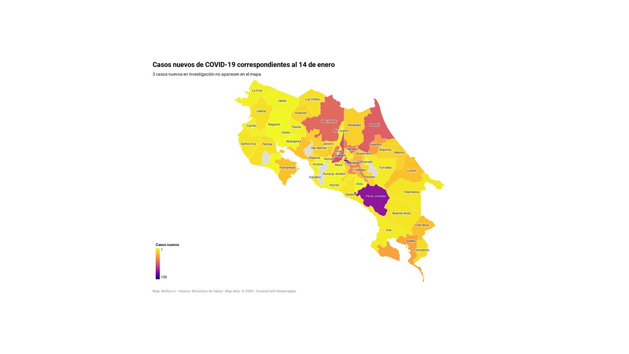 El Ministerio de Salud de Costa Rica informó la tarde de hoy que los 1086 casos nuevos de COVID-19 registrados en el país se ubican en 78 de los 82 cantones, los que no reportaron casos nuevos son: Hojancha, Jiménez, Montes de Oro y Turrubares.