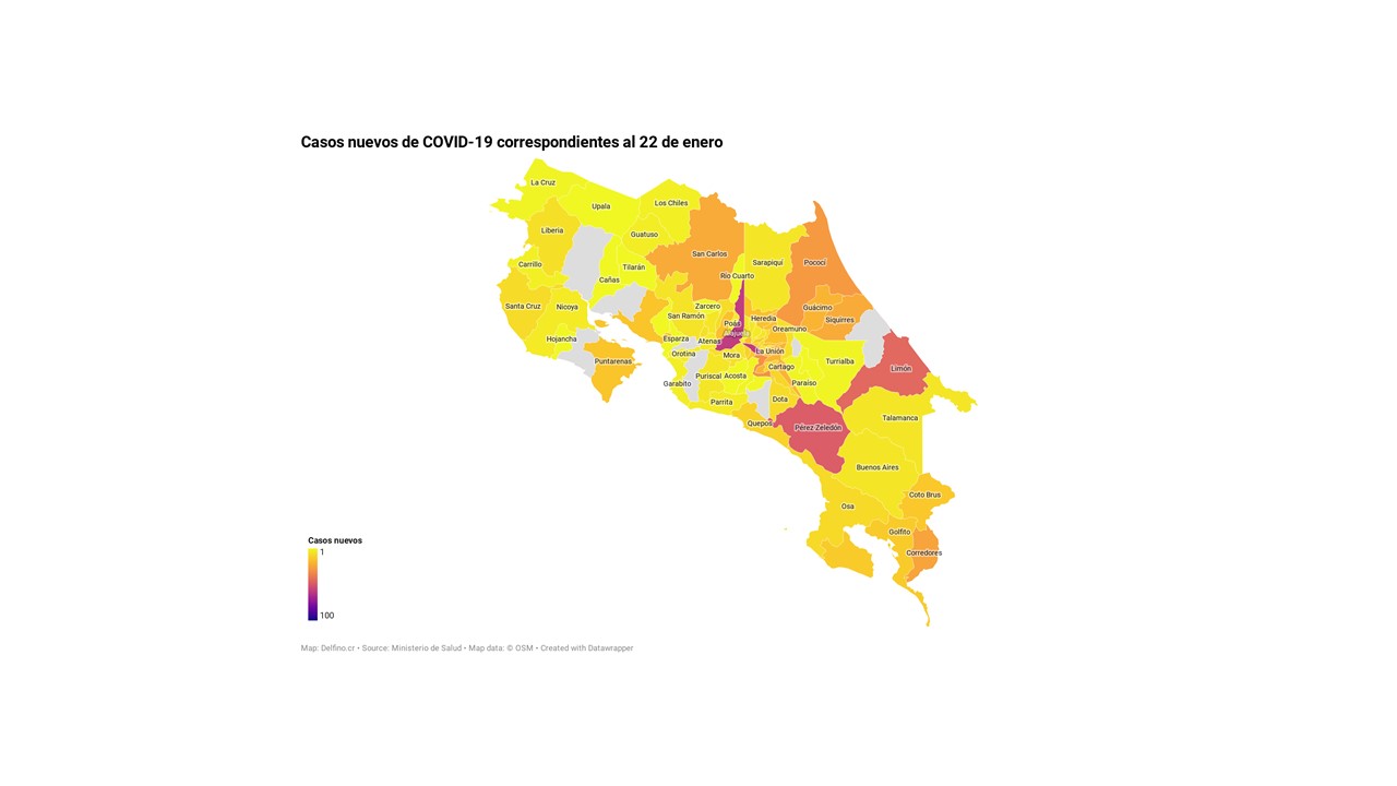 El Ministerio de Salud de Costa Rica informó la tarde de hoy que los 831 casos nuevos de COVID-19 registrados en el país se ubican en 74 de los 82 cantones, los que no reportaron casos nuevos son: Abangares, Alvarado, Bagaces, Matina, Nandayure, San Mateo, Tarrazú y Turrubares.