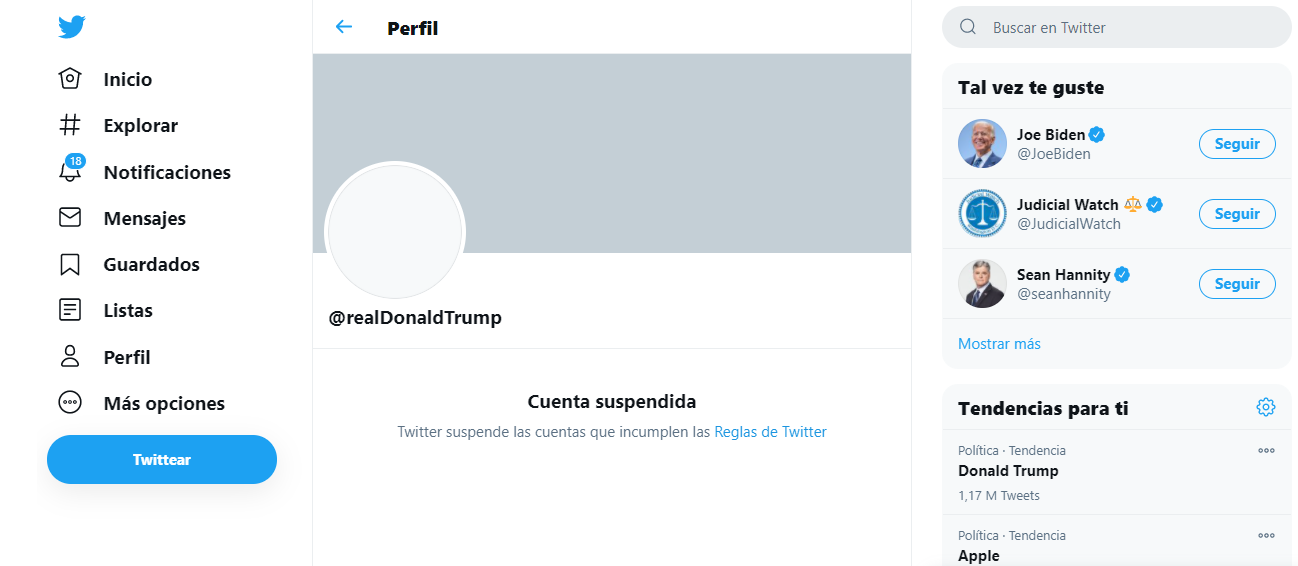La medida de Twitter fue anunciada horas después de que Facebook indicara que la suspensión de las cuentas de Trump en Facebook e Instagram se mantendrá, cuanto menos, hasta el 20 de enero, día en que el demócrata Joe Biden asumirá la presidencia.