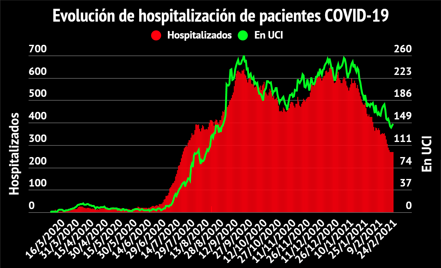 Hay 269 personas hospitalizadas (-1 respecto a ayer) de las cuales 147 están internadas en Unidades de Cuidados Intensivos (+3) con edades de entre 4 a 92 años.